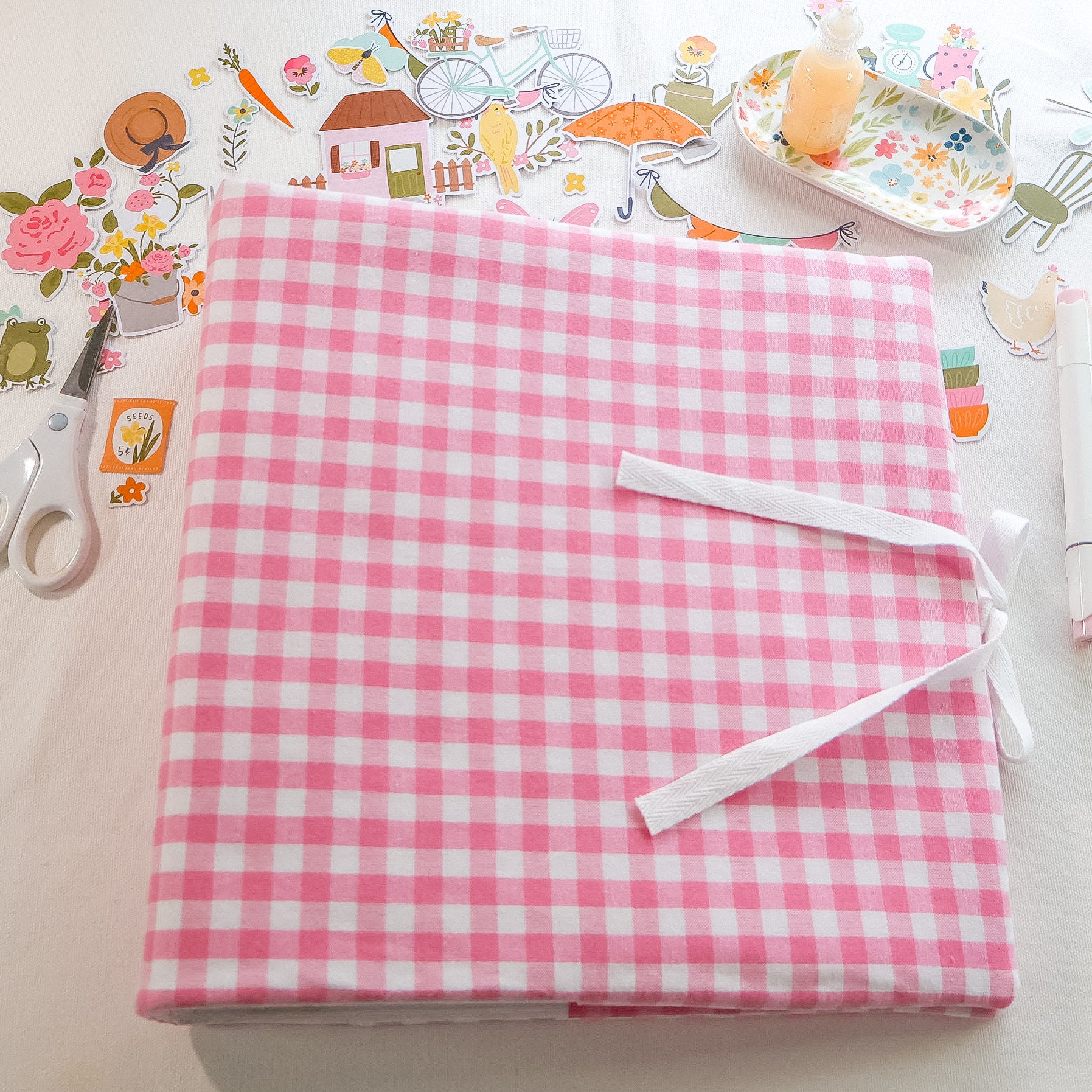 Pretty pink personalized gingham Photo album/ scrapbook with cotton fabric cover.